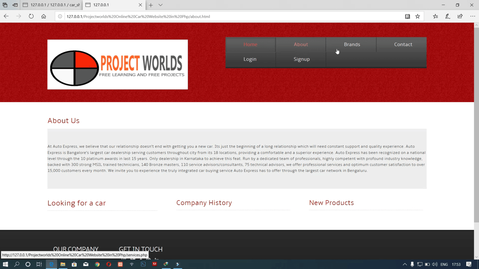 Car Showroom Management System is a mini php project that is used to keep and maintain the complete record of Cars. In this mini project is to provides keep the record of Cars, Customers, Company, Booking. We have developed this mini project Car Showroom Management System on PHP and MySQL. The main purpose of this mini project is to develop a website which provides all the information relates to car, car type, companies, customer, booking etc. There is a single user admin in this mini php project Car Showroom Management System. The admin can manage all the information related car, companies, booking, customer etc and after login admin can also edit, delete and update customer details such as name, types, phone, facility, email, address etc. You can view all cars, company, booking, customer related information, listing of cars, car company, car type, car booking etc.
