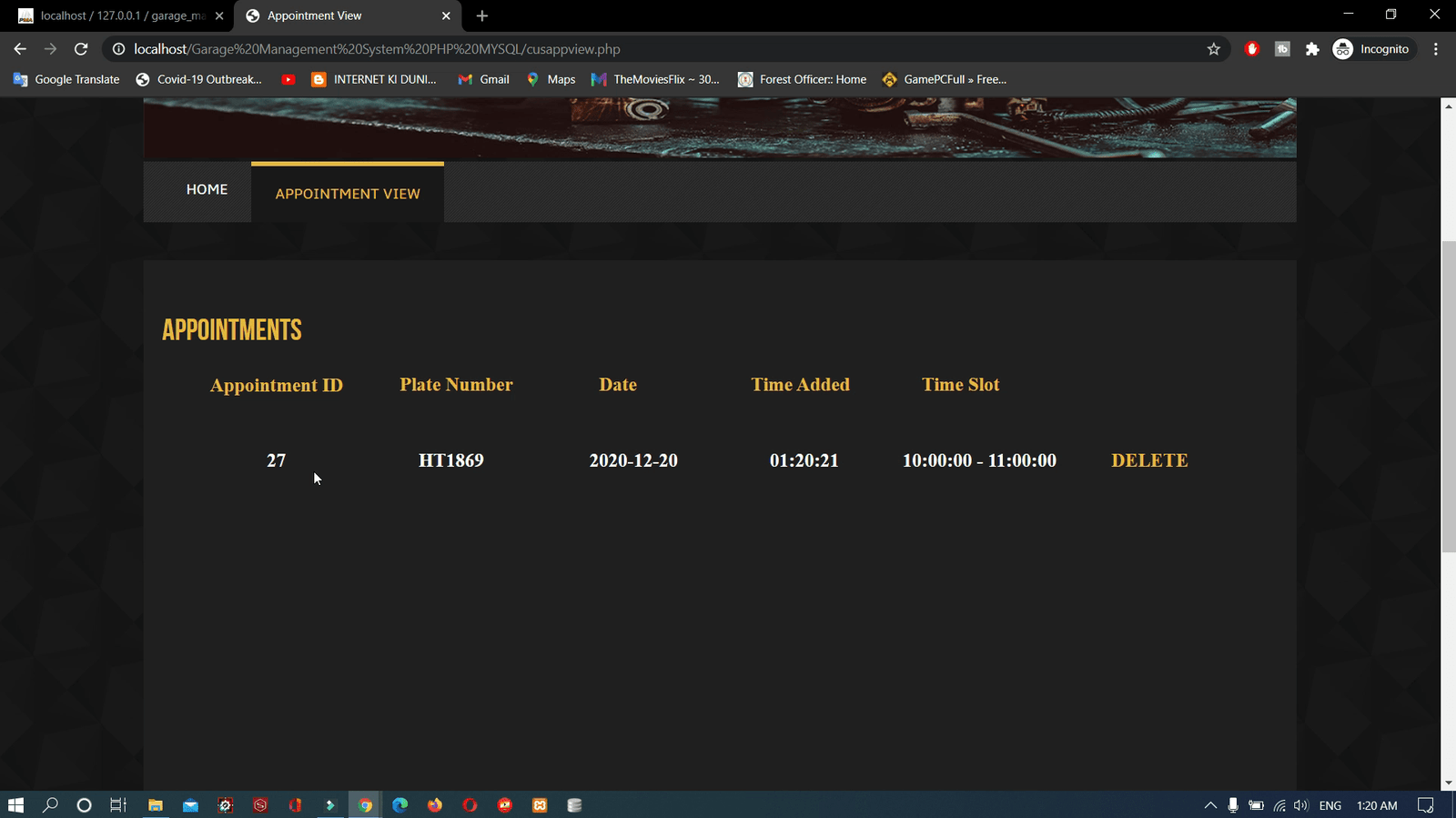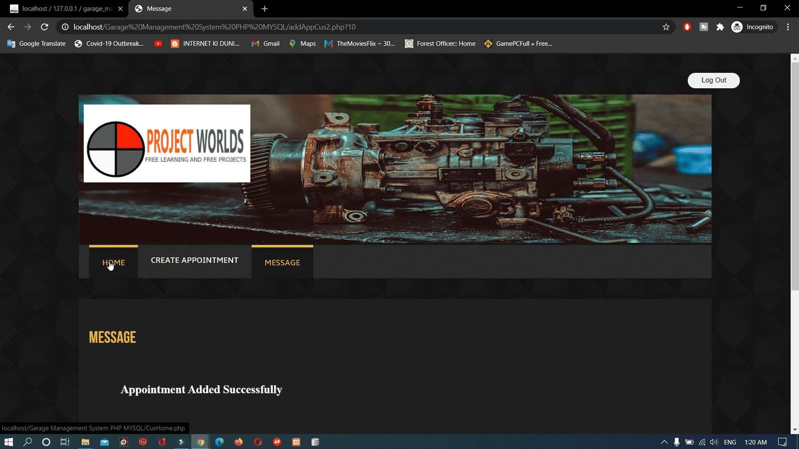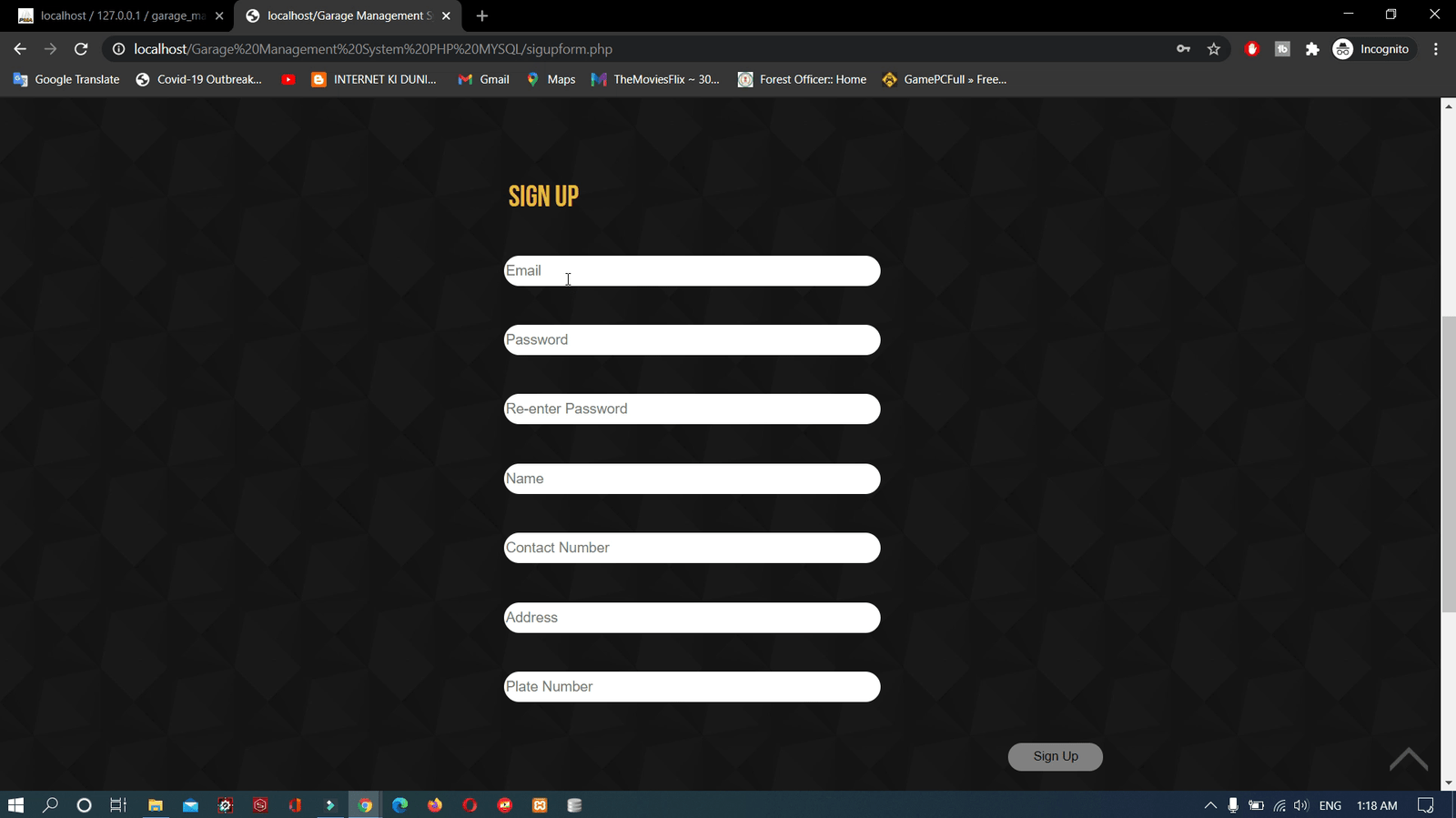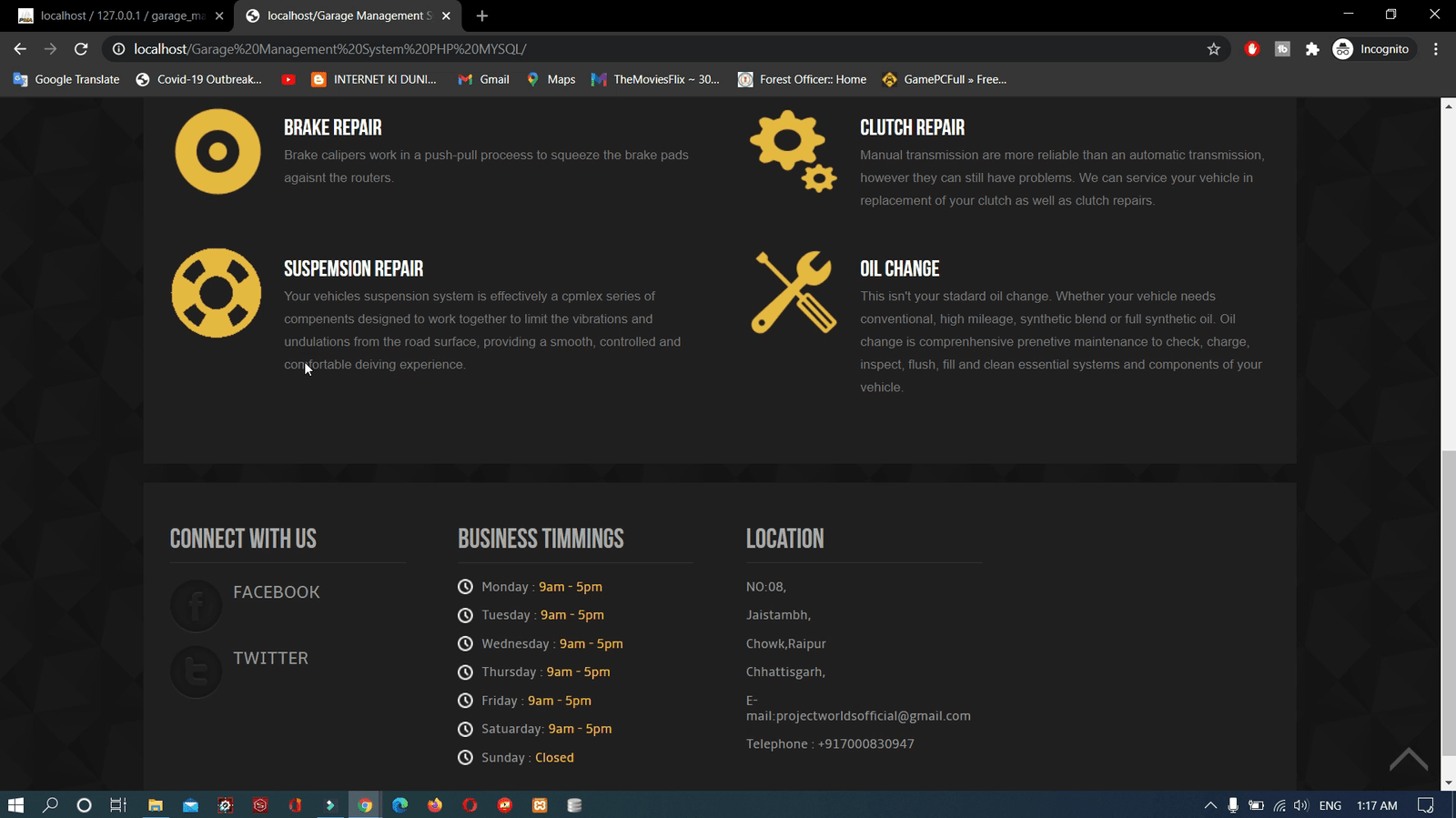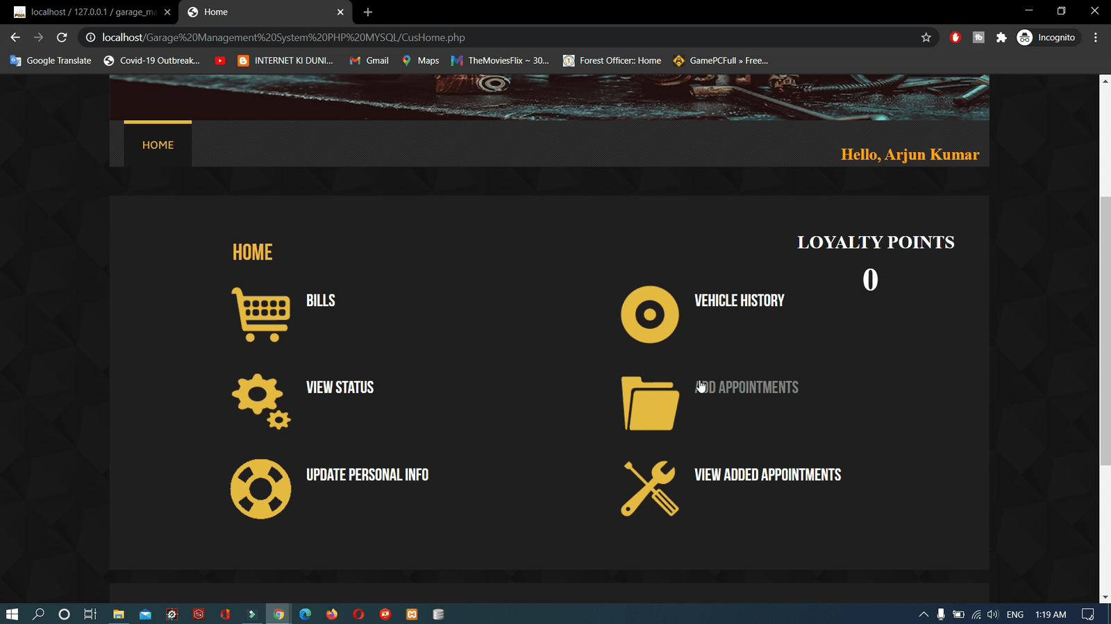 This Garage Management System shall help the user to keep track of all the activities in the garage. It is a web based application which shall have users like Manager, Supervisor, Security, Customer and Mechanic. The admin shall give access for specific modules for the other users. The users shall login and manage with the activities of the system. The supervisor shall be able to check for the inventory of vehicle spares in the garage. He shall be able to check for the vehicles that are serviced currently and the ones which has to be notified for services. The user also shall be able to note the mechanic shop time hours. The system will also allow the payment for the repair or service done. The system also can check for the vehicle spares that are sold from the garage. The interface is developed using html and PHP. It has user friendly web interface.