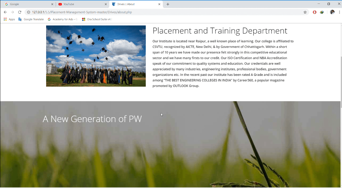 This project is aimed at developing an online application for the Training and Placement Dept. of the college. The system is an online application that can be accessed throughout the organization and outside as well with proper login provided. This system can be used as an application for the TPO of the college to manage the student information with regards to placement. Students logging should be able to upload their information in the form of a CV. Visitors/Company representatives logging in may also access/search any information put up by Students
