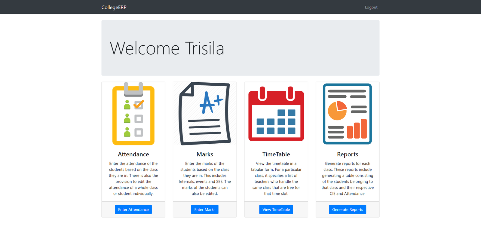 A college management system built using Django framework. It is designed for interactions between students and teachers. Features include attendance, marks and time table.