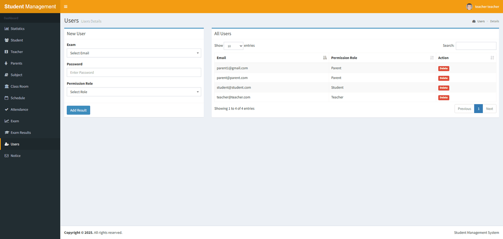 8. User Management: Define user roles and permissions for administrators, teachers, students, and parents.